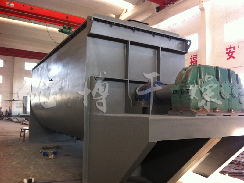 空心軸上密集排列著楔型中空漿葉,熱介質(zhì)經(jīng)空心軸流經(jīng)漿葉。單位有效容積內(nèi)傳熱面積很大,熱介質(zhì)溫度從-40℃到320℃,可以是水蒸汽,也可以是液體型:如熱水、導(dǎo)熱油等。間接傳導(dǎo)加熱,沒有攜帶空氣帶走熱量,熱量均用來加熱物料。熱量損失僅為通過器體保溫層向環(huán)境的散熱。楔型漿葉傳熱面具有自清潔功能。物料顆粒與楔型面的相對運動產(chǎn)生洗刷作用,能夠洗刷掉楔型面上附著物料,使運轉(zhuǎn)中一直保持著清潔的傳熱面。漿葉干燥機的殼體為Ω型,殼體內(nèi)一般安排二到四根空心攪拌軸。殼體有密封端蓋與上蓋,防止物料粉塵外泄而充分發(fā)揮作用。