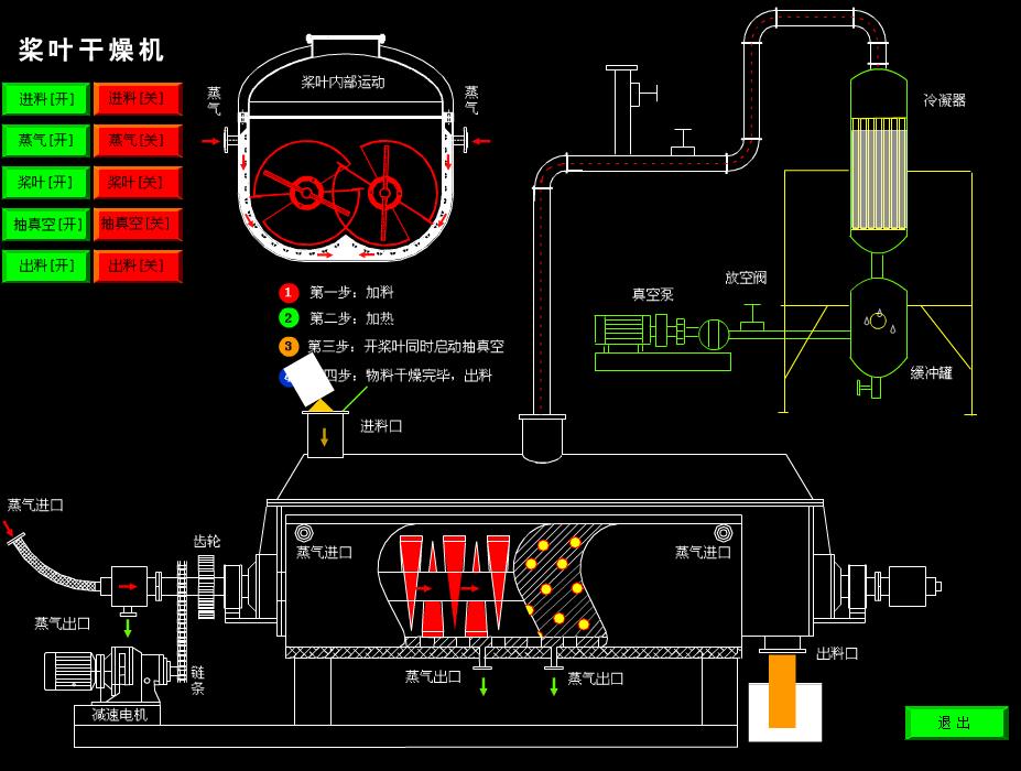 漿葉干燥機已成功地用于食品、化工、石化、染料、工業(yè)污泥等領(lǐng)域。設(shè)備傳熱、冷卻、攪拌的特性使之可以完成以下單元操作:燃燒(低溫)、冷卻、干燥(溶劑回收)加熱(融化)、反應(yīng)和滅菌。攪拌漿葉同時又是傳熱面,使單位有效容積內(nèi)傳熱面積增大,縮短了處理時間。楔型漿葉傳熱面又具有自清潔功能。壓縮--膨脹攪拌功能使物料混和均勻。物料沿軸向成"活塞流"運動,在軸向區(qū)間內(nèi),物料的溫度、濕度、混合度梯度很小。用導(dǎo)熱油做熱介質(zhì)漿葉干燥機可完成低溫燃燒工作。如:二水硫酸鈣(Ca2SO4·2H2O) 燃燒轉(zhuǎn)化為半水硫酸鈣(Ca2SO4·1/22H2O)。碳酸氫鈉(NaHCO3)經(jīng)煅燒轉(zhuǎn)化為純堿(Na2HCO3)等。通入冷卻介質(zhì),如水、冷卻鹽水等即可用來冷卻。如:使用于純堿行業(yè)的漿葉式?jīng)鰤A機,取代老式的空氣冷卻涼堿機,節(jié)省了能源及尾氣處理設(shè)備,降低了操作費用。干燥,設(shè)備主要的功能,不使用熱空氣,使溶劑回收、能源消耗、環(huán)境控制處于易處理的理想狀態(tài)。對需回收溶劑、易燃易氧化熱敏性物料尤為適應(yīng)。已廣泛用于精細化工、石化、染料行業(yè)。軸向區(qū)間內(nèi),溫度、濕度、混合度的均勻性,使得設(shè)備可用來加熱或融化,或進行一些固體物料反應(yīng)。在復(fù)合肥及變性淀粉行業(yè)均已成功使用。漿葉干燥機可用來對食物和面粉進行滅菌處理。單位有效容積內(nèi)大的加熱面積,很快就將物料加熱到滅菌溫度,避免了長時間加熱而改變物料品質(zhì)。