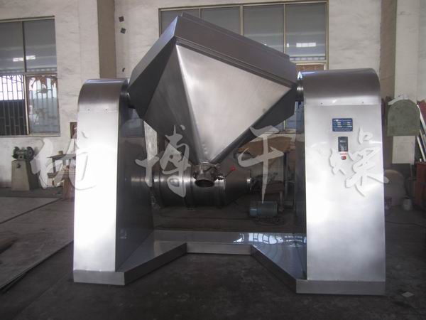 將物料裝入方錐形密閉混合桶內,料斗對稱的軸線與回轉軸軸線成一夾角,不同組分物料在密閉的料斗中進行三維空間運動,產生強烈翻轉和擴散收縮作用,達到混合效果。