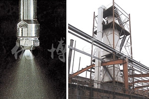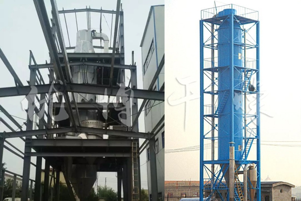 壓力噴霧干燥機(jī)工作過(guò)程為:料液通過(guò)隔膜泵高壓輸入,噴出霧狀液滴,然后同熱空氣并流下降,大部分粉粒由塔底排料口收集,廢氣及其微小粉末經(jīng)旋風(fēng)分離器分離,廢氣由抽風(fēng)機(jī)排出,粉末由設(shè)在旋風(fēng)分離器下的收粉筒收集,風(fēng)機(jī)出口處還可裝備二級(jí)除塵裝置,回收率在96%-98%。